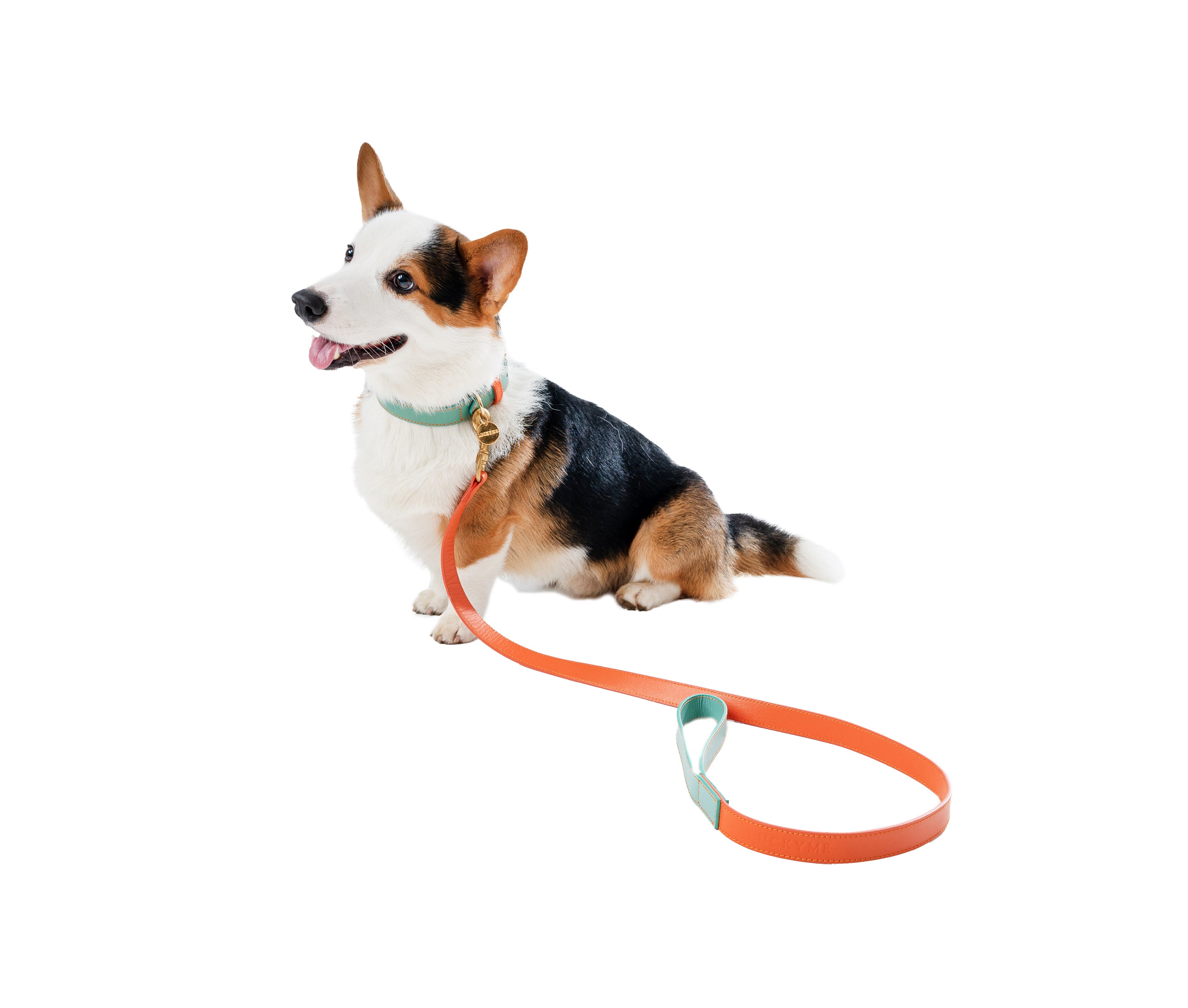 El collar, trabajado en cuero de primerísima calidad y teñido con tintas italianas, combina el tono papaya con el frescor vibrante del aquamarina, logrando una estética exótica, elegante y memorable. Los herrajes y medalla bañados en oro de 18k aportan el toque de lujo clásico que corona cada detalle.