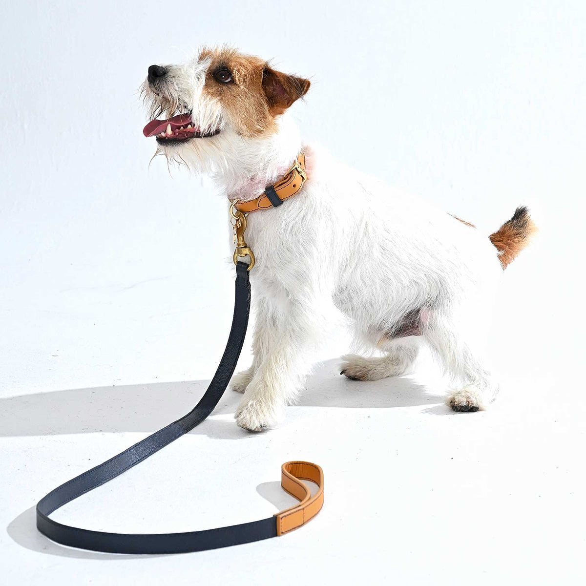 El collar, confeccionado en cuero de altísima calidad y teñido con tintas italianas, presenta un amarillo cálido que contrasta con un profundo tono azul blueberry. Sus herrajes y medalla bañados en oro de 18k elevan la pieza a un nivel de sofisticación silenciosa que perdura.