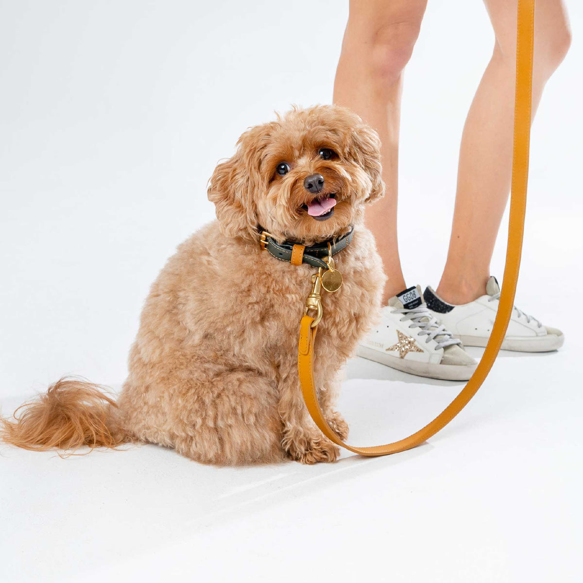 El collar, fabricado en cuero de altísima calidad y teñido con tintas italianas, combina el tono verde profundo con detalles en un cálido amarillo mostaza. Esta paleta evoca conexión con la tierra, serenidad y sofisticación silenciosa. Los herrajes y la medalla bañados en oro de 18k aportan el toque preciso de distinción.
